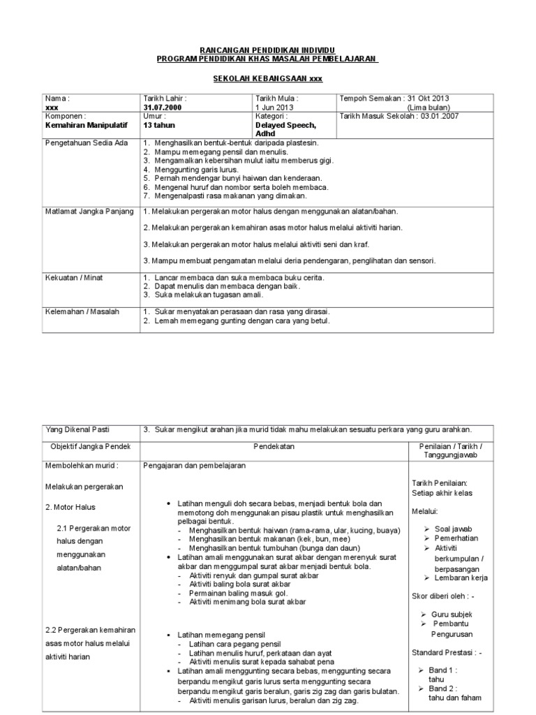 Rancangan Pendidikan Individu Program Pendidikan Khas Masalah Pembelajaran Sekolah Kebangsaan Xxx Pdf